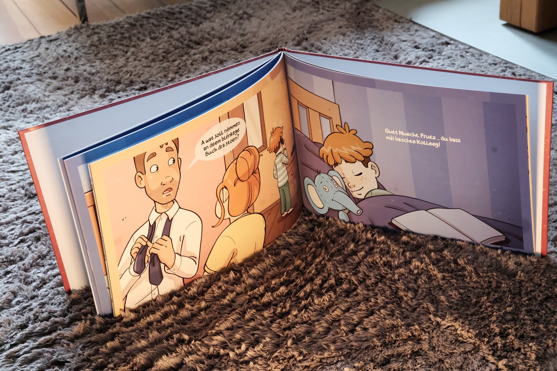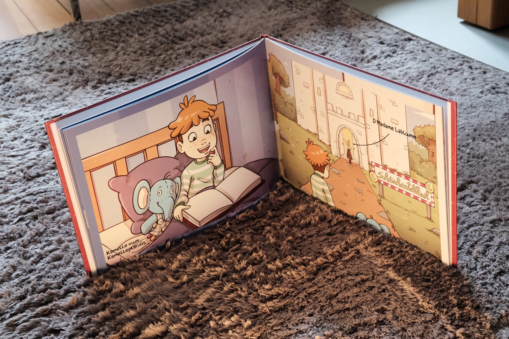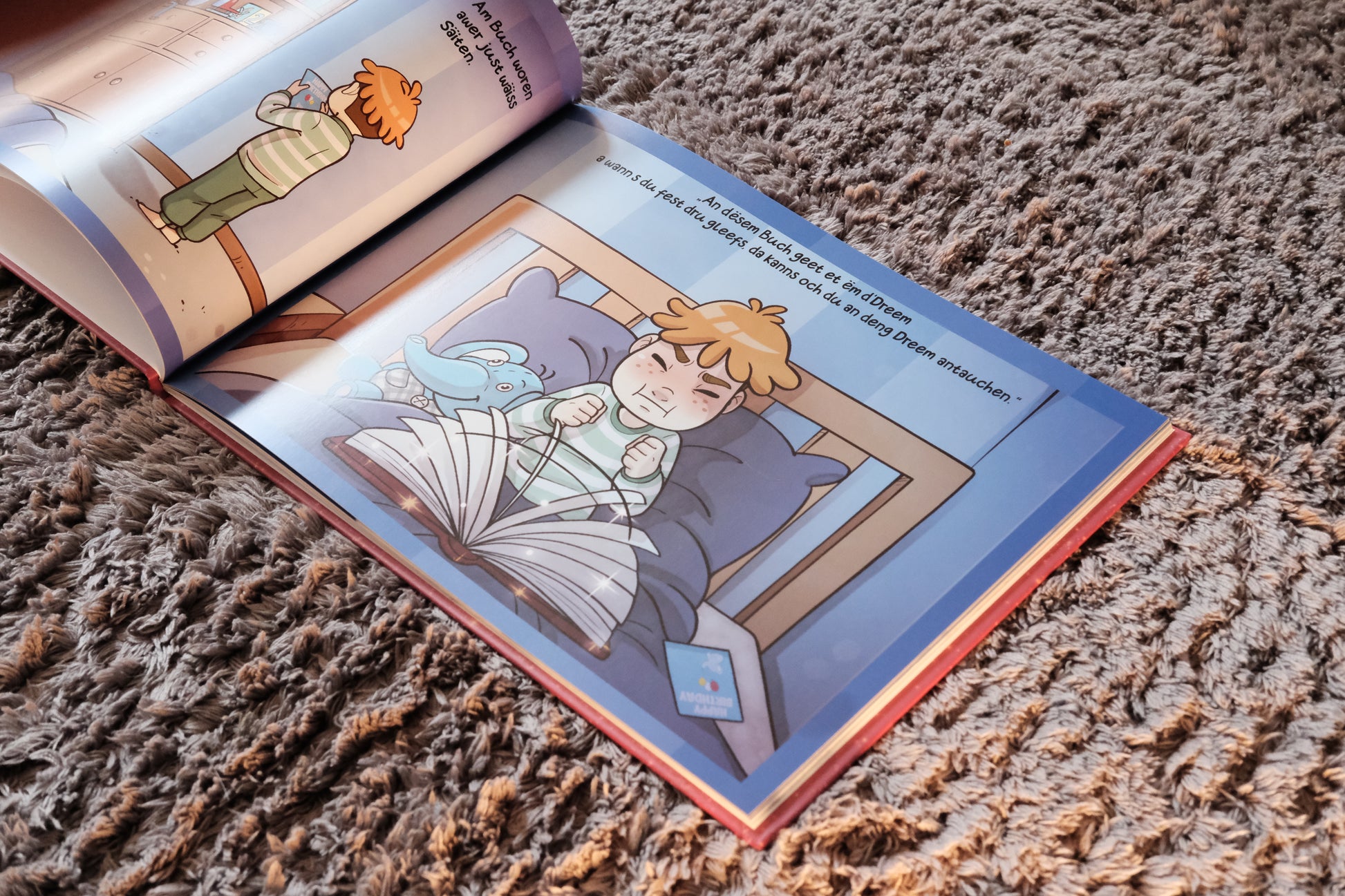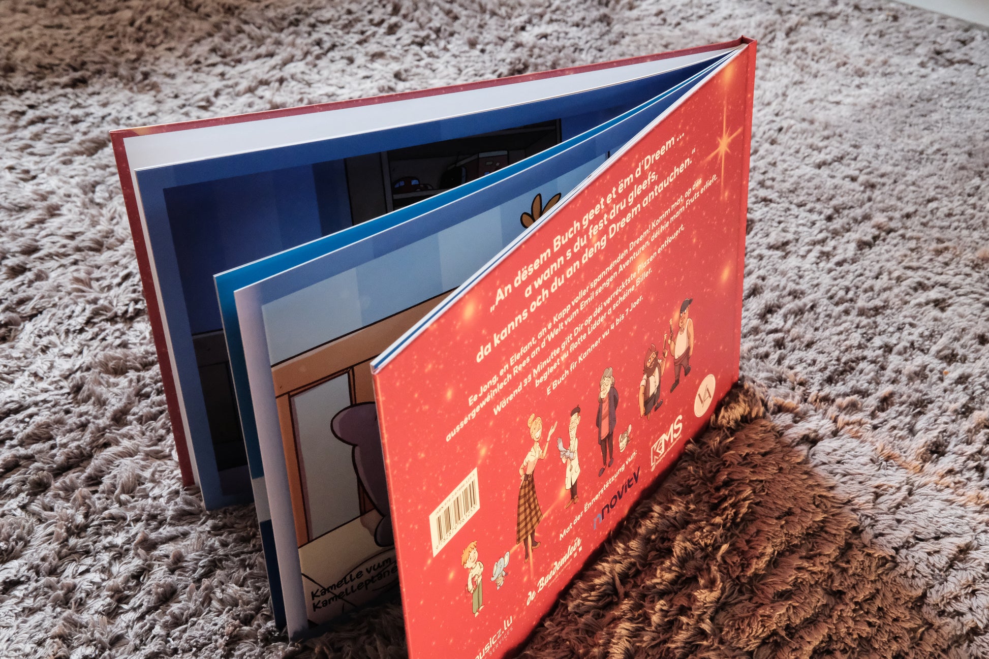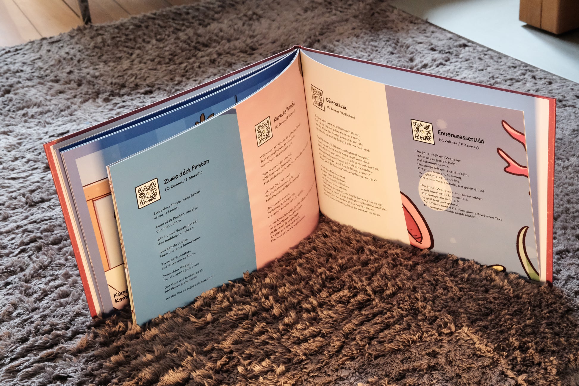 D'Geschicht gett per QR code oofgespillt. Hannen am Buch befennt sech nach een QR code, wou een d'Biller kann rooflueden, fir dei faarweg ze molen :)